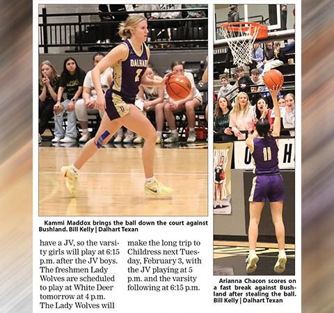 The Lady Wolves led the first half against Bushland. Kammi Maddox knocked down a three and led Dalhart with five points in the first period. Arianna Chacon also hit a three, and Joie Read added two points. Dalhart held a 10-7 lead after one period.
