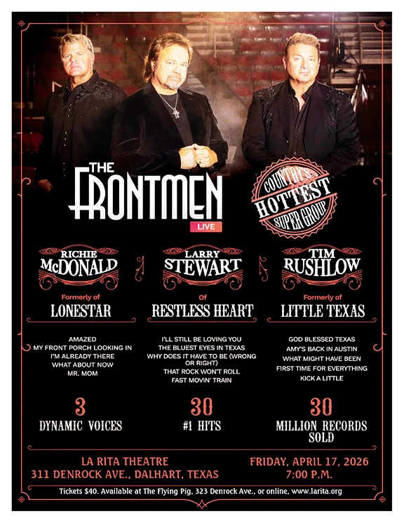 This will be the second time in less than 12 months that The Frontmen have performed in Dalhart. They were one of the musical groups to sing at the XIT Rodeo & Reunion last August, and are returning to Dalhart to sing at the historic La Rita Theatre in downtown Dalhart.